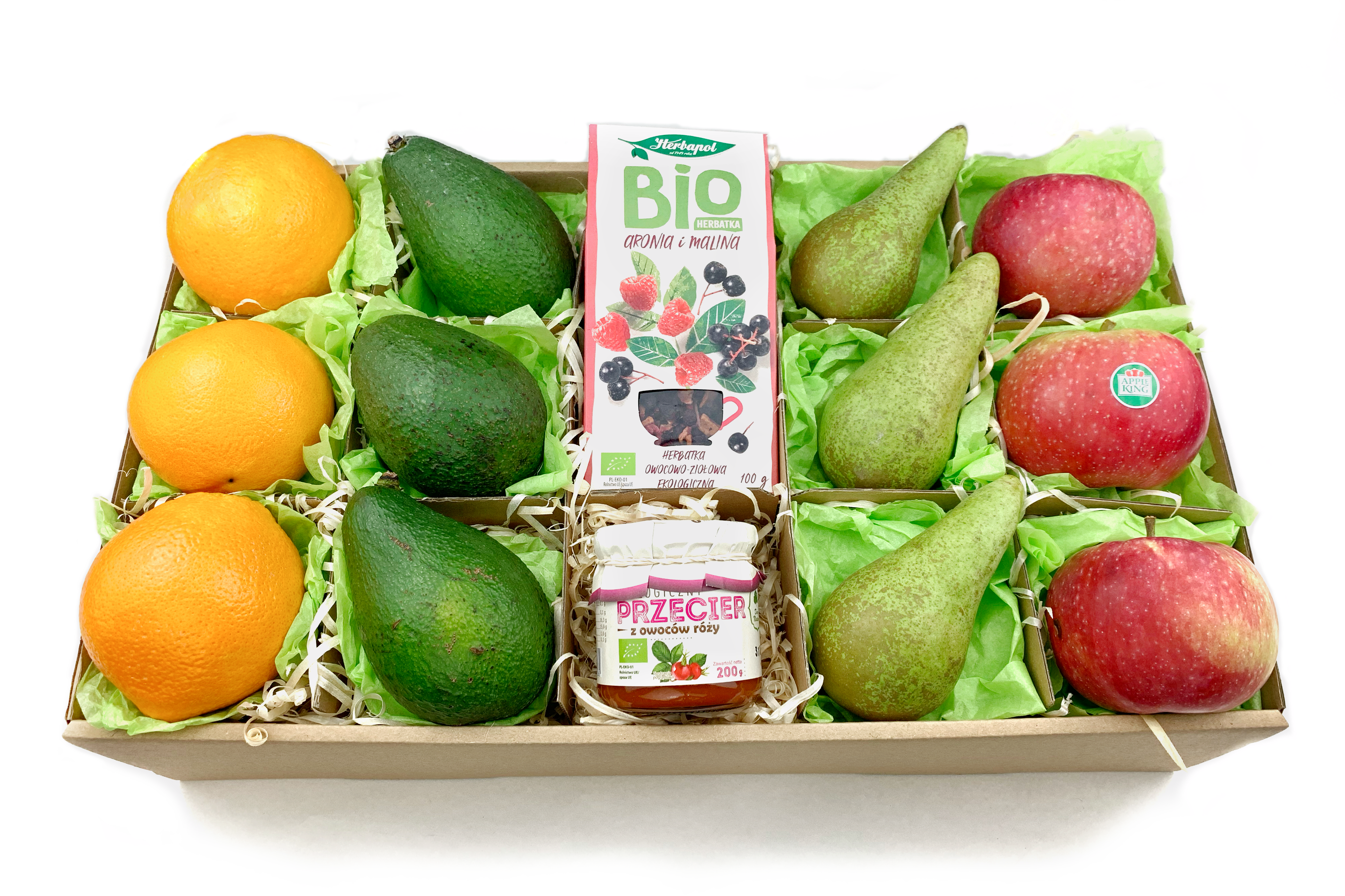 Owocowy prezent 101 – pomarańcze awokado gruszki jabłka herbata przecier z róży