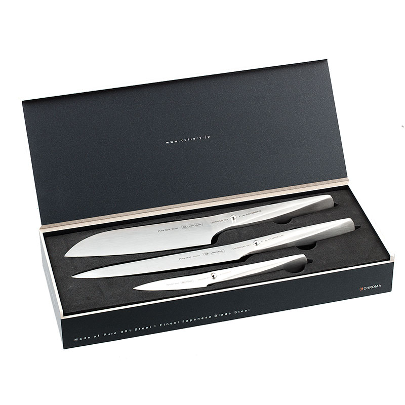 - At superwnetrze.pl you can purchase Zestaw noży japo?skich 3szt Chroma Type 301 Hammered for only 999.00